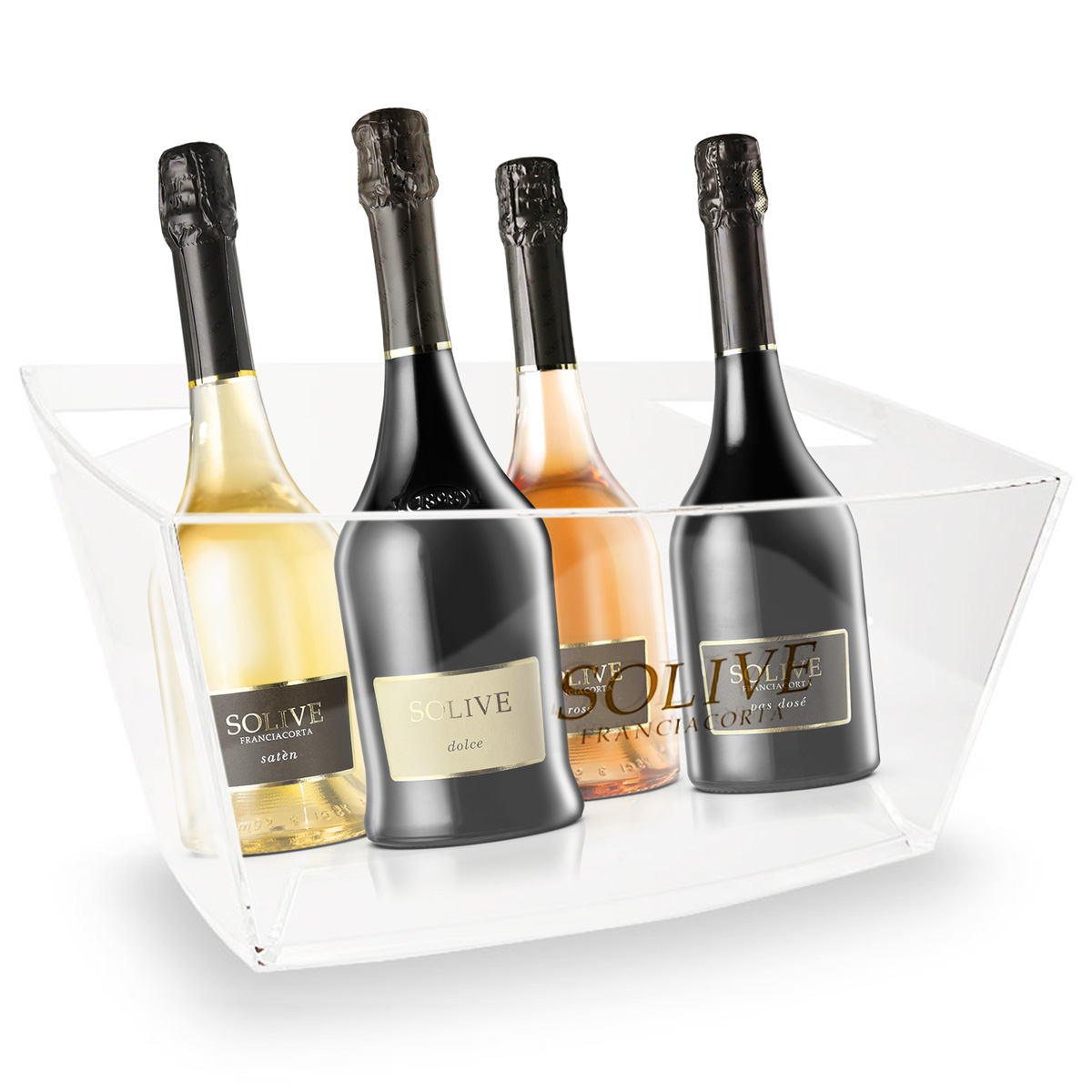 Una confezione davvero esclusiva! Due bicchieri con logo Solive e la tua bottiglia di Franciacorta preferita a scelta tra Brut, Satèn, Rosè, Pas Dosè e Millesimato Giosep
